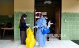 Dokter dari Dinas Kesehatan Kota Yogyakarta usai melakukan vaksinasi Covid-19 untuk lansia di UPT Rumah Pelayanan Lansia Budi Dharma, Umbulharjo, Yogyakarta, Senin (4/10). Pelayanan vaksinasi Covid-19 dilakukan dengan sistem jemput bola. Hal ini dilakukan untuk lansia yang memiliki keterbatasan untuk pergi ke sentra vaksinasi Covid-19. Ada sembilan warga lansia yang bisa divaksinasi kali ini setelah dilakukan pemeriksaan kesehatan. (FOTO : Wihdan Hidayat / Republika)