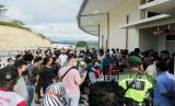 Warga tertahan di pintu masuk akibat pembatasan jumlah penonton saat pertandingan bola voli Indoor Putra antara tim Papua melawan Jawa Barat di GOR Voli Indoor Koya Kosa, Kota Jayapura, Papua Senin (4/10). PON XX Papua digelar pada masa pandemi Covid-19 dengan menerapkan protokol kesehatan seperti penggunaan masker, pembatasan jumlah penonton, serta menjaga jarak di setiap arena. Republika/Thoudy Badai (FOTO : Republika/Thoudy Badai)