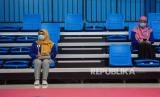 Penonton mengenakan masker saat menyaksikan pertandingan Sepak Takraw di GOR Trikora Universitas Cendrawasih, Distrik Abepura, Kota Jayapura, Papua, Senin (4/10). PON XX Papua digelar pada masa pandemi Covid-19 dengan menerapkan protokol kesehatan seperti penggunaan masker, pembatasan jumlah penonton, serta menjaga jarak di setiap arena. Republika/Thoudy Badai (FOTO : Republika/Thoudy Badai)