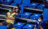 REPUBLIKA.CO.ID, JAYAPURA -- Penonton mengenakan masker saat menyaksikan pertandingan bola voli Indoor Putra di GOR Voli Indoor Koya Kosa, Kota Jayapura, Papua Senin (4/10). PON XX Papua digelar pada masa pandemi Covid-19 dengan menerapkan protokol kesehatan seperti penggunaan masker, pembatasan jumlah penonton, serta menjaga jarak di setiap arena.