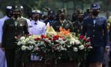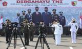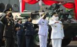 REPUBLIKA.CO.ID, SURABAYA -- Gubernur Jawa Timur Khofifah Indar Parawansa bersama Pangdam V/Brawijaya Mayjen TNI Suharyanto, Pangkoarmada II Laksda TNI Iwan Isnurwanto dan Kapolda Jawa Timur Irjen Pol Nico Afinta (kiri) melakukan penghormatan saat mengikuti upacara peringatan HUT ke-76 TNI secara virtual di Kodam V/Brawijaya, Surabaya, Jawa Timur, Selasa (5/10/2021). HUT ke-76 TNI mengusung tema Bersatu, Berjuang, Kita Pasti Menang.