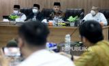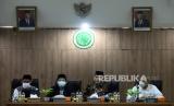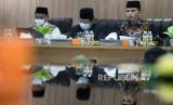 Ketua Majelis Ulama Indonesia (MUI) Bidang Fatwa Asrorun Niam Sholeh (dua kanan) memberikan keterangan terkait kehalalan Vaksin Zifivax di Kantor MUI di Jakarta, Sabtu (9/10). MUI menyatakan bahwa vaksin Covid-19 produksi perusahaan China, Anhui Zhifei Longcom Biopharmaceutical yaitu Vaksin Zifivax halal dan suci. vaksin Zifivax ini dinyatakan halal dan suci setelah dilakukan pengkajian dari aspek teknis dan syar (FOTO : Prayogi/Republika.)