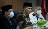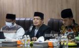 Sekjen Majelis Ulama Indonesia (MUI) MUI amirsyahTambunan (tengah) saat memberikan keterangan terkait kehalalan Vaksin Zifivax di Kantor MUI di Jakarta, Sabtu (9/10). MUI menyatakan bahwa vaksin Covid-19 produksi perusahaan China, Anhui Zhifei Longcom Biopharmaceutical yaitu Vaksin Zifivax halal dan suci. vaksin Zifivax ini dinyatakan halal dan suci setelah dilakukan pengkajian dari aspek teknis dan syar (FOTO : Prayogi/Republika.)