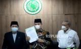 REPUBLIKA.CO.ID,JAKARTA -- Ketua Majelis Ulama Indonesia (MUI) Bidang Fatwa Asrorun Niam Sholeh menunjukan surat pernyataan kehalalan Vaksin Zifivax di Kantor MUI di Jakarta, Sabtu (9/10).