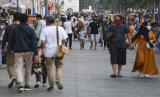 Warga bersama anaknya berwisata di kawasan Kali Besar, Kota Tua, Jakarta, Sabtu (9/10/2021). Kementerian Pariwisata dan Ekonomi Kreatif (Kemenparekraf) memberikan diskresi bagi anak berusia di bawah 12 tahun untuk bisa masuk ke objek wisata dengan syarat harus ditemani orang tua yang sudah menerima vaksin COVID-19. (FOTO : ANTARA/Hafidz Mubarak A)