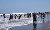 Warga berwisata di Pantai Parangtritis, Bantul, Yogyakarta, Ahad (10/10). Pantai Parangtritis ramai dikunjungi warga meski status belum dibuka sejak PPKM Darurat lalu. Sehingga pengunjung masuk tanpa ada membayar retribusi masuk kawasan pantai. Tetapi, ekonomi bergeliat imbas ramainya pengunjung pada akhir pekan. (FOTO : Wihdan Hidayat / Republika)
