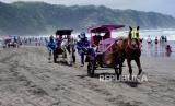 Andong wisata membawa wisatawan berkeliling di Pantai Parangtritis, Bantul, Yogyakarta, Ahad (10/10). Pantai Parangtritis ramai dikunjungi warga meski status belum dibuka sejak PPKM Darurat lalu. Sehingga pengunjung masuk tanpa ada membayar retribusi masuk kawasan pantai. Tetapi, ekonomi bergeliat imbas ramainya pengunjung pada akhir pekan. (FOTO : Wihdan Hidayat / Republika)