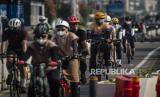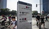 Warga bersepeda di Jalan Jenderal Sudirman, Jakarta, Ahad (10/10/2021). Warga berolahraga dengan menerapkan prokes saat penerapan Pemberlakuan Pembatasan Kegiatan Masyarakat (PPKM) di ibu kota. (FOTO : ANTARA/Aprillio Akbar)