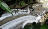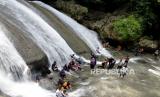 Pengunjung menikmati suasana air terjun di area Taman Wisata Alam (TWA) Bantimurung, Kabupaten Maros, Sulawesi Selatan, Ahad (10/10/2021). TWA Bantimurung tersebut merupakan habitat berbagai jenis kupu-kupu dengan beberapa destinasi wisata menarik seperti danau, air terjun, gua serta kolam permandian alami dan mulai ramai dikunjungi wisatawan saat libur akhir pekan seiring penerapan Pemberlakuan Pembatasan Kegiatan Masyarakat (PPKM) level dua di daerah itu. (FOTO : ANTARA/Arsenas Padda)