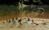 Berbagai jenis kupu-kupu hinggap di pinggir Danau Kassi Kebo di area Taman Wisata Alam (TWA) Bantimurung, Kabupaten Maros, Sulawesi Selatan, Ahad (10/10/2021). TWA Bantimurung tersebut merupakan habitat berbagai jenis kupu-kupu dengan beberapa destinasi wisata menarik seperti danau, air terjun, gua serta kolam permandian alami dan mulai ramai dikunjungi wisatawan saat libur akhir pekan seiring penerapan Pemberlakuan Pembatasan Kegiatan Masyarakat (PPKM) level dua di daerah itu. (FOTO : ANTARA/Arnas Padda)