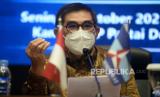 Kuasa Hukum Partai Demokrat Hamdan Zoelva memberikan keterangan terkait perkara permohonan pengujian AD/ART Partai Demokrat di Mahkamah Agung di Kantor DPP Partai Demokrat, Jakarta, Senin (11/10). Dalam keterangaanya Hamdan Zoelva mengatakan permohonan pengujian tersebut tidak lazim, karena menjadikan AD/ART Partai Demokrat sebagai salah satu jenis peraturan perundang-undangan.Prayogi/Republika. (FOTO : Prayogi/Republika.)