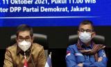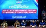 REPUBLIKA.CO.ID, JAKARTA -- Kuasa Hukum Partai Demokrat, Hamdan Zoelva, didampingi para pengurus partai memberikan keterangan terkait perkara permohonan pengujian AD/ART Partai Demokrat di Mahkamah Agung, di kantor DPP Partai Demokrat, Jakarta, Senin (11/10).