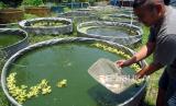 Peternak memberi pakan pelet untuk ikan nila merah bangkok yang dibudidayakan di MinaB Agribisnis, Cikaret, Kota Bogor, Jawa Barat, Selasa (12/10/2021). Budidaya ikan nila merah bangkok dengan sistem bioflok dan aquaponik tersebut memiliki kapasitas hingga 1.500 ekor dan mampu menghasilkan satu hingga dua kuintal untuk sekali panen dengan harga jual Rp30 ribu per kilogram. (FOTO : ANTARA/Arif Firmansyah)