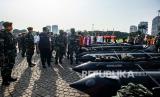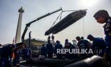 Personel Polairud memindahkan perahu karet ke atas kendaraan usai mengikuti Apel Kesiapsiagaan Menghadapi Musim Hujan Tingkat Provinsi DKI Jakarta, di Silang Selatan Monas, Jakarta, Rabu (13/10/2021). Apel gabungan tersebut diikuti oleh 1.458 peserta yang terdiri dari unsur TNI, Polri, BPBD DKI Jakarta, unsur Pemprov DKI, dan relawan tanggap bencana. (FOTO : Antara/Aprillio Akbar)