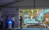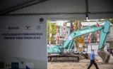 Pekerja berjalan di dekat alat berat saat peresmian pembangunan Simpang Temu Dukuh Atas di Jakarta, Rabu (13/10). Pemerintah Provinsi DKI Jakarta memulai pembangunan Simpang Temu Dukuh Atas yang merupakan area transit yang mempertemukan sejumlah moda transportasi umum dan ditargetkan rampung pada Juni 2022. Republika/Putra M. Akbar (FOTO : Republika)