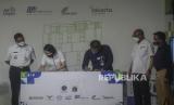 Gubernur DKI Jakarta Anies Baswedan bersama Direktur Konstruksi PT MRT Jakarta Silvia Halim, Senior Vice President Head Of Operation Building Division PT PP Andek Prabowo, Direktur Utama PT MRT Jakarta William Sabandar (dari kiri ke kanan) saat penandatanganan kerja sama pembangunan Simpang Temu Dukuh Atas di Jakarta, Rabu (13/10). Pemerintah Provinsi DKI Jakarta memulai pembangunan Simpang Temu Dukuh Atas yang merupakan area transit yang mempertemukan sejumlah moda transportasi umum dan ditargetkan rampung pada Juni 2022. Republika/Putra M. Akbar Republika/Putra M. Akbar (FOTO : Republika/Putra M. Akbar)