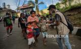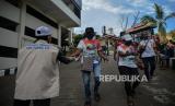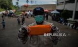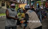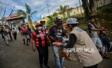 REPUBLIKA.CO.ID, JAYAPURA -- Petugas membagikan masker kepada penonton sebelum pertandingan final sepak bola putra PON Papua antara tim Papua melawan Nangroe Aceh Darussalam di Stadion Mandala, Kota Jayapura, Kamis (14/10), Re