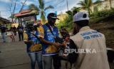 Petugas membagikan masker kepada penonton sebelum pertandingan final sepak bola putra PON Papua antara tim Papua melawan Nangroe Aceh Darussalam di Stadion Mandala, Kota Jayapura, Kamis (14/10), Republika/Thoudy Badai (FOTO : Republika/Thoudy Badai)