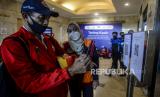 Atlet DKI Jakarta memindai kode batang sebelum menjalani karantina di Hotel Grand Cempaka Business, Jakarta, Kamis (14/10). Pemerintah Provinsi DKI Jakarta telah menyiapkan dua fasilitas isolasi terpusat di Hotel Grand Cempaka Business dan D Arcici Sunter Hotel untuk atlet dan ofisial kontingen DKI Jakarta yang akan menjalani karantina selama lima hari sepulangnya dari perhelatan Pekan Olahraga Nasional (PON) XX Papua. (FOTO : Republika/Putra M. Akbar)