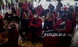Sejumlah atlet dan ofisial DKI Jakarta menunggu reservasi kamar untuk menjalani karantina di Hotel Grand Cempaka Business, Jakarta, Kamis (14/10). Pemerintah Provinsi DKI Jakarta telah menyiapkan dua fasilitas isolasi terpusat di Hotel Grand Cempaka Business dan D Arcici Sunter Hotel untuk atlet dan ofisial kontingen DKI Jakarta yang akan menjalani karantina selama lima hari sepulangnya dari perhelatan Pekan Olahraga Nasional (PON) XX Papua. (FOTO : Republika/Putra M. Akbar)