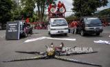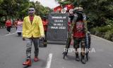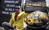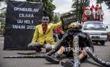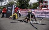 Sejumlah buruh yang tergabung dalam Kongres Aliansi Serikat Buruh Indonesia (KASBI) melakukan aksi teatrikal saat aksi nasional di depan Gedung Sate, Jalan Diponegoro, Kota Bandung, Kamis (14/10). Dalam aksi yang bertepatan dengan Hari Jadi ke-76 World Federation of Trade Unions (WFTU), KASBI menyerukan Sepuluh Tuntutan Rakyat (Sepultura) diantaranya menuntut pemerintah untuk mencabut Omnibus Law dan seluruh turunannya serta menolak Penghapusan Upah Sektoral. (FOTO : REPUBLIKA/ABDAN SYAKURA)