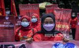 Sejumlah buruh yang tergabung dalam Kongres Aliansi Serikat Buruh Indonesia (KASBI) melakukan aksi nasional di depan Gedung Sate, Jalan Diponegoro, Kota Bandung, Kamis (14/10). Dalam aksi yang bertepatan dengan Hari Jadi ke-76 World Federation of Trade Unions (WFTU), KASBI menyerukan Sepuluh Tuntutan Rakyat (Sepultura) diantaranya menuntut pemerintah untuk mencabut Omnibus Law dan seluruh turunannya serta menolak Penghapusan Upah Sektoral.. (FOTO : REPUBLIKA/ABDAN SYAKURA)