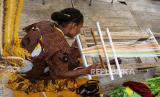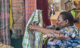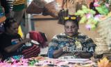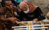 REPUBLIKA.CO.ID, JAYAPURA -- Penenun kain tervo Salonika Ambani (kiri) mengajarkan cara menenun kepada seorang wisatawan di sebuah stan Pameran dan Pagelaran Budaya Nasional di Holtekamp Jayapura, Papua, Kamis (14/10/2021). Sekitar 200 seniman Papua ikut berpartisipasi dalam kegiatan tersebut dengan menampilkan ribuan karya seni untuk ikut menyemarakkan PON Papua sekaligus menarik wisatawan domestik maupun mancanegara.
