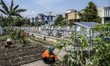 Warga merawat sayuran di kebun Buruan SAE (Pekarangan Sehat, Alami dan Ekonomis) yang sudah terintegrasi dengan panel surya di komplek perumahan De Marrakesh, Jalan Ciwastra, Rancasari, Kota Bandung, Kamis (14/10). Warga di perumahan tersebut berinisiatif untuk melakukan inovasi cara berkebun di pekarangan dengan menggunakan panel surya sebagai sumber energi lampu penerangan serta menghidupkan pompa air guna mengairi perkebunan. Foto: Republika/Abdan Syakura (FOTO : REPUBLIKA/ABDAN SYAKURA)