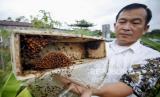 Agustinus Gabriel pemilik UMKM madu Lun Tau Balikpapan memanen madu lebah kelulut di Balikpapan, Kalimantan Timur, Jumat (15/10/2021). Madu Lun Tau mitra UMKM binaan Pertamina tersebut dijual dengan kisaran harga Rp57.000 hingga Rp500.000 sesuai ukuran, dan dipasarkan keseluruh kota-kota besar di Indonesia. (FOTO : ANTARA/Yulius Satria Wijaya)