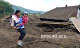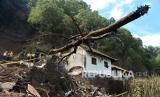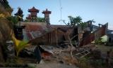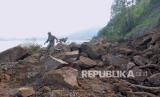 REPUBLIKA.CO.ID, BANGLI -- Prajurit TNI berjalan di sekitar bukit yang longsor akibat gempa di kawasan Kintamani, Bangli, Bali, Sabtu (16/10/2021). Gempa bumi dengan magnitudo 4,8 SR terjadi di darat pada jarak delapan kilometer barat laut Karangasem dengan kedalaman 10 km pada Sabtu (16/10) pukul 04.18 WITA.