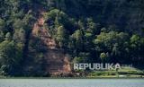 Longsoran bukit akibat gempa terlihat dari Danau Batur, Kintamani, Bangli, Bali, Sabtu (16/10/2021). Gempa bumi dengan magnitudo 4,8 SR yang terjadi di darat pada jarak delapan kilometer barat laut Karangasem dengan kedalaman 10 km pada Sabtu (16/10) pukul 04.18 Wita mengakibatkan sejumlah bangunan di Bali rusak dan tiga orang meninggal dunia. (FOTO : Antara/Fikri Yusuf)