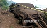 Mobil tertimbun longsoran bukit akibat gempa di kawasan Trunyan, Kintamani, Bangli, Bali, Sabtu (16/10/2021). Gempa bumi dengan magnitudo 4,8 SR yang terjadi di darat pada jarak delapan kilometer barat laut Karangasem dengan kedalaman 10 km pada Sabtu (16/10) pukul 04.18 Wita mengakibatkan sejumlah bangunan di Bali rusak dan tiga orang meninggal dunia. (FOTO : Antara/Fikri Yusuf)