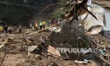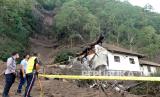 Petugas mengamati rumah yang rusak tertimbun longsoran bukit akibat gempa di kawasan Trunyan, Kintamani, Bangli, Bali, Sabtu (16/10/2021). Gempa bumi dengan magnitudo 4,8 SR yang terjadi di darat pada jarak delapan kilometer barat laut Karangasem dengan kedalaman 10 km pada Sabtu (16/10) pukul 04.18 Wita mengakibatkan sejumlah bangunan di Bali rusak dan tiga orang meninggal dunia. (FOTO : Antara/Fikri Yusuf)