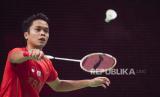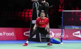 Anthony Sinisuka Ginting beraksi dalam pertandingan tunggal final beregu putra Piala Thomas antara China dan Indonesia, di Aarhus, Denmark, Ahad (17/10). (FOTO : EPA-EFE/CLAUS FISKER )
