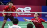 Fajar Alfian (kiri) dan Muhammad Rian Ardianto (kanan) beraksi dalam pertandingan ganda putra final bulu tangkis Piala Thomas antara China dan Indonesia, di Aarhus, Denmark, Ahad (17/10). (FOTO : EPA-EFE/CLAUS FISKER )