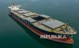 Foto udara Kapal MV Amanah Morowali yang tengah berlabuh jangkar sekitar empat mil laut di perairan Laut Jawa, Semarang, Jawa Tengah, Selasa, (19/10/2021). Kapal pengangkut barang curah terbesar yang dimiliki PT Samudera Indonesia dengan kapasitas mencapai 90 ribu ton tersebut untuk melayani angkutan curah domestik Indonesia hingga ekspor ke China. (FOTO : Antara/Aji Styawan)
