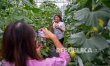 Pengunjung berswafoto di Taman Hati Farm, Tamansari, Kota Tasikmalaya, Jawa Barat, Selasa (19/10/2021). Pelita memanfaatkan teknologi modern dengan mengubah lahan tidak produktif menjadi kawasan budidaya melon golden alisha, kirani, dan dalmatian dengan sistem green house, serta menjual melon dengan sistem petik sendiri di lokasi. (FOTO : Antara/Adeng Bustami)