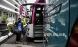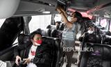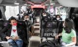 Sejumlah atlet dan ofisial cabang olahraga catur kontingen Jawa Barat berada di dalam bus usai menjalani karantina di Hotel Grand Preanger, Jalan Asia Afrika, Kota Bandung, Selasa (19/10). Sebanyak 170 atlet dan ofisial kontingen Jawa Barat dari berbagai cabang olahraga pada gelombang pertama telah menjalani masa karantina selama lima hari guna memastikan kesehatan atlet dan ofisial serta mengantisipasi penyebaran Covid-19. Foto: Republika/Abdan Syakura (FOTO : REPUBLIKA/ABDAN SYAKURA)