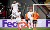 Reals Karim Benzema (L) celebrates after scoring the 5-0 lead during the UEFA Champions League group D soccer match between Shakhtar Donetsk and Real Madrid in Kiev, Ukraine, 19 October 2021. (FOTO : EPA-EFE/SERGEY DOLZHENKO)