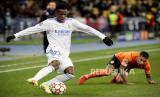 Vinicius Junior dari Real Madrid (kiri) berusaha mengontrol bola pada pertandingan lanjutan Liga Champions melawan tuan rumah Shakhtar di Kiev, Ukraina, Rabu (20/10) dini hari WIB. (FOTO : EPA-EFE/SERGEY DOLZHENKO)