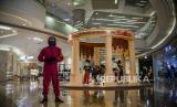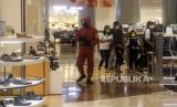Petugas keamanan yang memakai kostum serial drama Squid Game berjalan di dekat warga yang mengunjungi pusat perbelanjaan di Jakarta, Rabu (20/10). Libur Maulid Nabi Muhammad SAW 1443 Hijriah dimanfaatkan warga untuk berlibur mengunjungi pusat perbelanjaan bersama keluarga pasca pelonggaran kegiatan operasional mal pada masa PPKM level 2 yang memperbolehkan tempat permainan anak untuk beroperasi. Republika/Putra M. Akbar (FOTO : Republika/Putra M. Akbar)