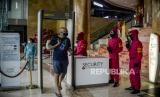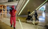 Petugas keamanan yang memakai kostum serial drama Squid Game menyambut warga yang mengunjungi pusat perbelanjaan di Jakarta, Rabu (20/10). Libur Maulid Nabi Muhammad SAW 1443 Hijriah dimanfaatkan warga untuk berlibur mengunjungi pusat perbelanjaan bersama keluarga pasca pelonggaran kegiatan operasional mal pada masa PPKM level 2 yang memperbolehkan tempat permainan anak untuk beroperasi. (FOTO : Republika/Putra M. Akbar)