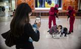 Warga berfoto dengan petugas keamanan yang memakai kostum serial drama Squid Game di salah satu pusat perbelanjaan di Jakarta, Rabu (20/10). Libur Maulid Nabi Muhammad SAW 1443 Hijriah dimanfaatkan warga untuk berlibur mengunjungi pusat perbelanjaan bersama keluarga pasca pelonggaran kegiatan operasional mal pada masa PPKM level 2 yang memperbolehkan tempat permainan anak untuk beroperasi. (FOTO : Republika/Putra M. Akbar)
