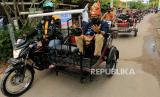 Menparekraf Sandiaga Salahuddin Uno menumpang becak motor saat mengunjungi Desa Gampong Nusa, Lhoknga, Aceh Besar, Aceh, Rabu (20/10/2021). Kunjungan Menparekraf ke desa wisata Gampong Nusa tersebut merupakan bagian dari kunjungan ke 50 desa wisata terbaik pada ajang Anugerah Desa Wisata Indonesia (ADWI) 2021 dengan tujuan untuk mewujudkan desa wisata berkelas dunia, berdaya saing dan berkelanjutan. (FOTO : ANTARA/Syifa Yulinnas)