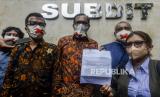 Direktur Eksekutif Lokataru Haris Azhar (tengah) bersama Koordinator Kontras Fatia Maulidiyanti (kanan), Kepala Advokasi dan Pengacara LBH Jakarta Nelson Simamora (kedua kiri) dan Kuasa Hukum Pieter Ell (kedua kanan) memperlihatkan surat usai memenuhi undangan mediasi di Mapolda Metro Jaya, Jakarta, Kamis (21/10). Mediasi terkait dugaan pencemaran nama baik yang dilaporkan Menteri Koordinator Bidang Kemaritiman dan Investasi Luhut Binsar Pandjaitan tersebut ditunda oleh pihak kepolisian hingga waktu yang ditentukan oleh penyidik. Republika/Putra M. Akbar (FOTO : Republika/Putra M. Akbar)