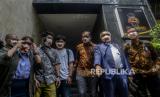 Direktur Eksekutif Lokataru Haris Azhar (ketiga kanan) bersama Koordinator Kontras Fatia Maulidiyanti (kiri), Kepala Advokasi dan Pengacara LBH Jakarta Nelson Simamora (kanan) dan Kuasa Hukum Pieter Ell (kedua kanan) usai memenuhi undangan mediasi di Mapolda Metro Jaya, Jakarta, Kamis (21/10). Mediasi terkait dugaan pencemaran nama baik yang dilaporkan Menteri Koordinator Bidang Kemaritiman dan Investasi Luhut Binsar Pandjaitan tersebut ditunda oleh pihak kepolisian hingga waktu yang ditentukan oleh penyidik. Republika/Putra M. Akbar (FOTO : Republika/Putra M. Akbar)