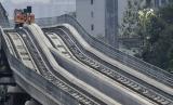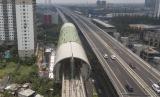 Suasana pembangunan lintasan LRT (Light Rail Transit) di Bekasi, Jawa Barat, Kamis (21/10/2021). Progres keseluruhan pembangunan prasarana LRT Jabodebek telah mencapai 87,54 persen dengan rincian, lintasan pelayanan I Cawang-Cibubur 93,94 persen, lintas pelayanan II Cawang-Dukuh Atas 87,99 persen, lintas pelayanan III Cawang-Bekasi Timur 92,25 persen dan pembangunan fisik 18 stasiun telah mencapai 90 persen. A (FOTO : ANTARA/Fakhri Hermansyah)