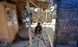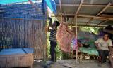 Warga membangun hunian sementara dari bambu di kawasan Banjar Darmaji, Desa Ban, Karangasem, Bali, Rabu (20/10/2021). Warga setempat yang tempat tinggalnya mengalami kerusakan akibat bencana gempa bumi 4,8 SR Karangasem Bali mulai membangun tempat hunian sementara dengan memanfaatkan sisa-sisa material seperti bambu dan kayu dari runtuhan rumah mereka serta menggunakan bantuan terpal yang diberikan warga. (FOTO : ANTARA/Fikri Yusuf)