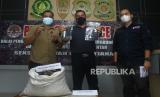 Tiga petugas memperlihatkan barang bukti hasil tangkapan sisik dari hewan trenggiling (Manis Javanica) saat rilis kasus di Balai Gakkum KLHK Wilayah Kalimantan di Kabupaten Kubu Raya, Kalimantan Barat, Kamis (21/10/2021). Tim Ditjen Gakkum KLHK Pencegahan menyita 14,6 kilogram sisik yang diduga berasal dari 140 ekor hewan trenggiling (Manis Javanica) yang dibunuh dan dikuliti, dari dua pedagang di Desa Nanga Taman, Kecamatan Nanga Taman, Kabupaten Sekadau, Kalbar pada Senin (18/10/2021). (FOTO : ANTARA/Jessica Helena Wuysang/foc.)