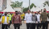 Presiden Joko Widodo (tengah) didampingi Menteri PUPR Basuki Hadimuljono (kiri), Menteri BUMN Erick Thohir (kedua kanan), Gubernur Kalimantan Selatan Sahbirin Noor (kedua kiri) dan Wali Kota Banjarmasin Ibnu Sina (ketiga kanan) berjalan meninjau Jembatan Sungai Alalak di Banjarmasin, Kalimantan Selatan, Kamis (21/10/2021). Dalam kunjungan kerja di Kalimantan Selatan, Presiden Joko Widodo melakukan serangkaian kegiatan seperti peresmian pabrik biodiesel level B30 di Kabupaten Tanah Bumbu, meninjau pelaksanaan vaksinasi COVID-19 di RS Anshari Saleh dan peresmian Jembatan Sungai Alalak di Banjarmasin. (FOTO : Antara/Bayu Pratama S)